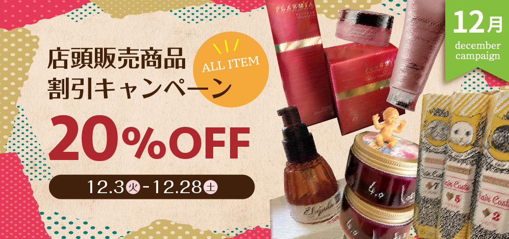 12月恒例の店販キャンペーンが今年も始まります!販売商品を全品20%OFFにて販売致します!ぜひこの機会にどうぞ。